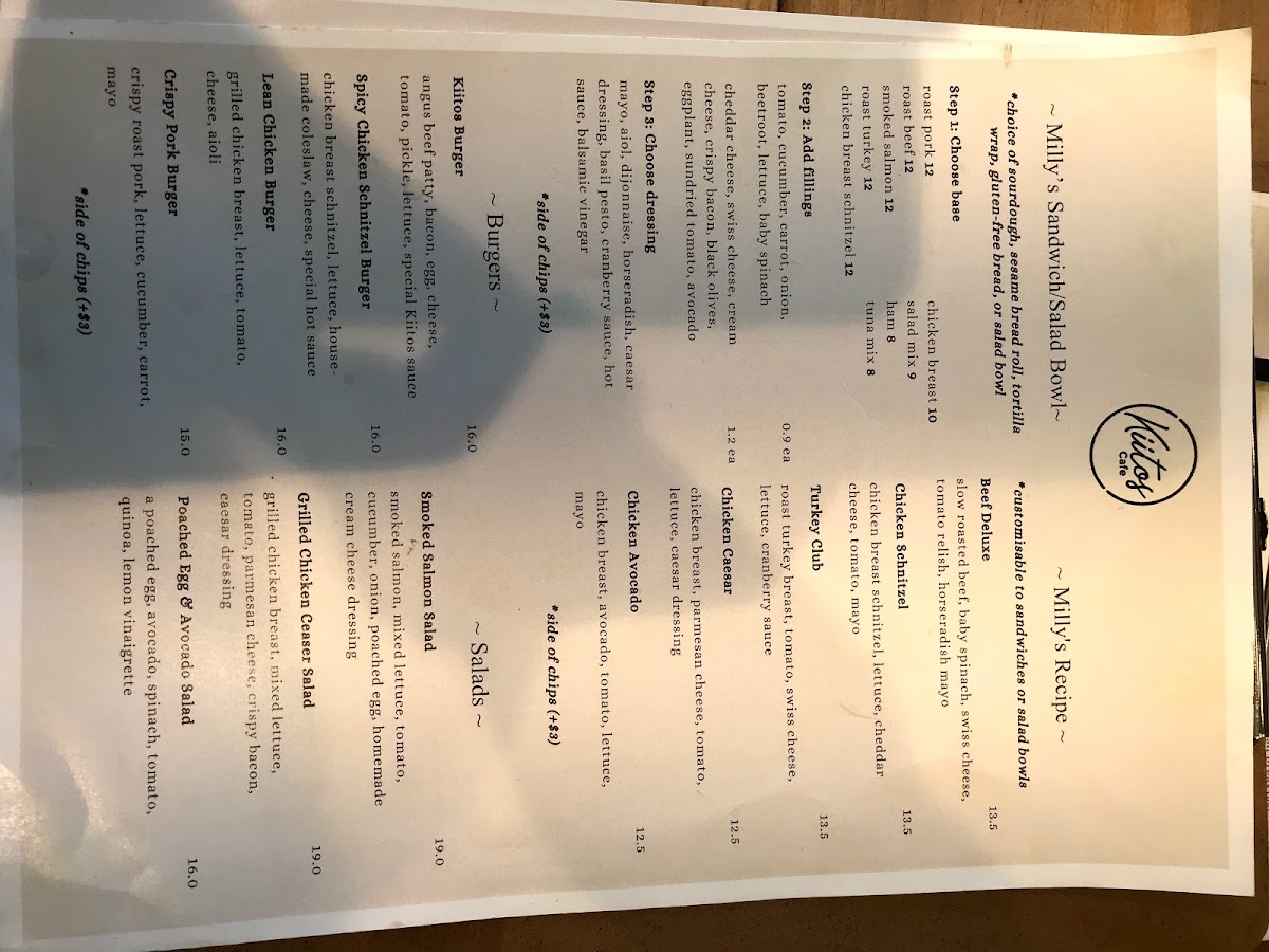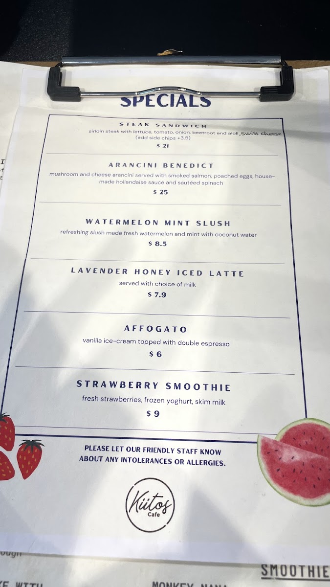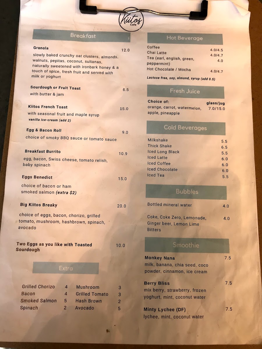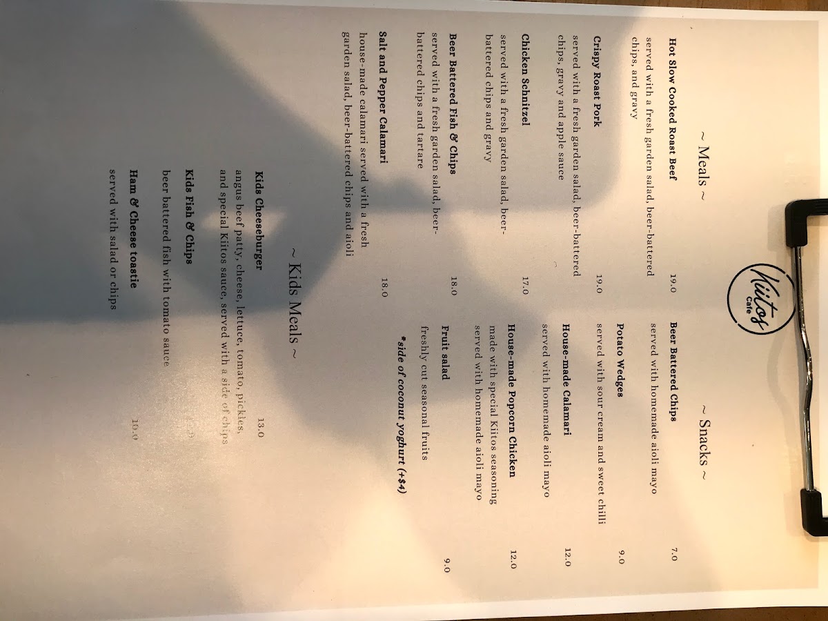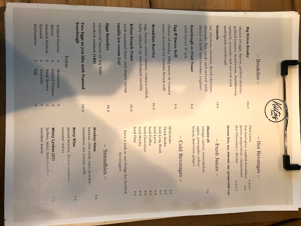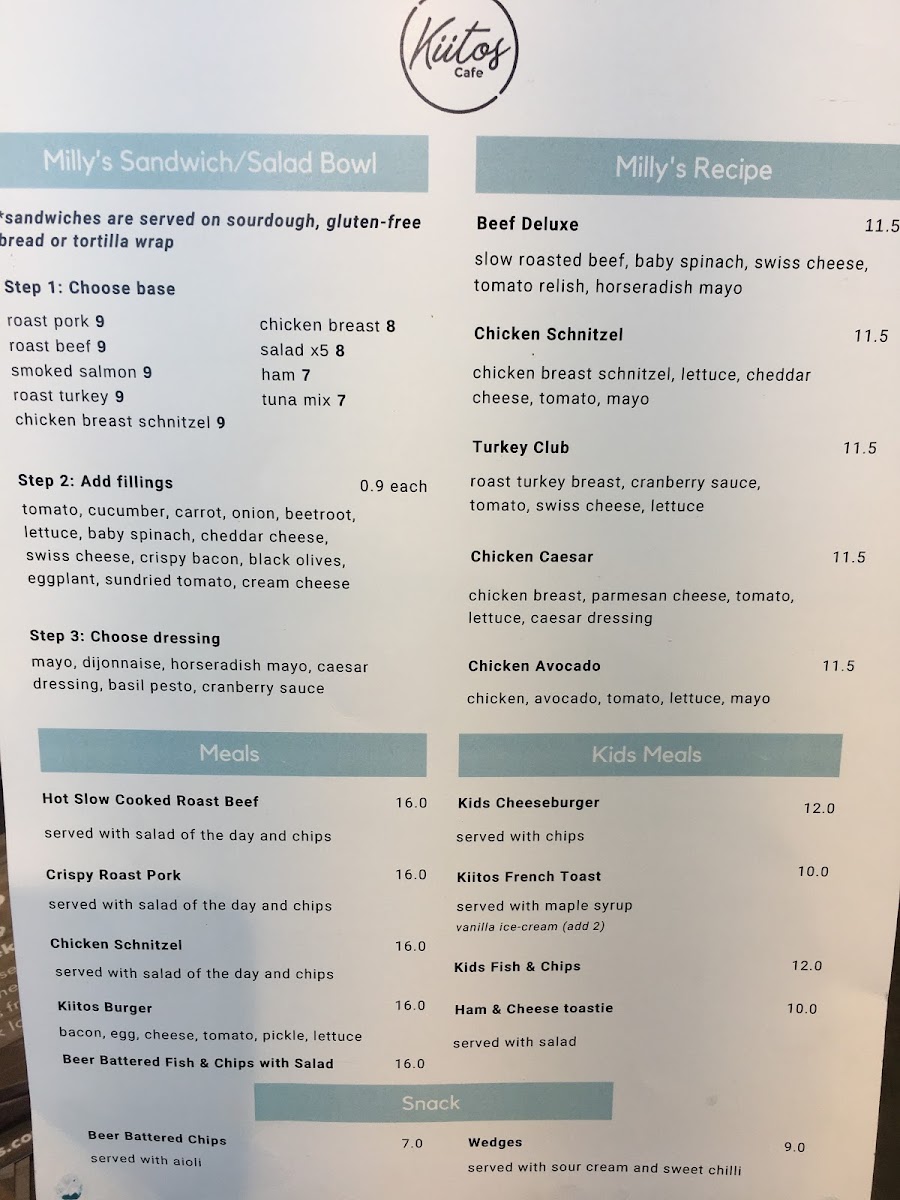 - Breakfast: Includes choices such as Granola, Sourdough or Fruit Toast, Kiitos French Toast, Egg & Bacon Roll, Breakfast Burrito, Eggs Benedict, Big Kiitos Breaky, and Two Eggs as You Like with Toasted Sourdough.